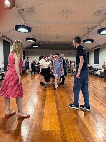 Ceilidh dancing is led by Heather, the band’s piano player and dance caller, whose clear, enthusiastic calling helps everyone feel confident enough to join in.