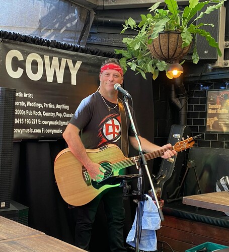 Andrew Cowan (‘Cowy’) is an accomplished guitarist and vocalist with his own brand of acoustic rock. With only an acoustic guitar, stomp pedal and vocals, Cowy’s show may seem simple, but this is quickly dispelled as percussive rhythms and strong vocals bring a bold, exciting energy to his live show. With a repertoire spanning the Beatles, Eagles and Cold Chisel through to Bon Jovi, Guns N' Roses and a mix of classics from the 60s to now, Cowy’s show delivers a barrage of energetic covers of a wide variety of Australian and International hits.